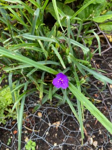 A lone purple flower shows that the wire is doing its job! A local cat was constantly digging up this plant! I think we’ve saved it.